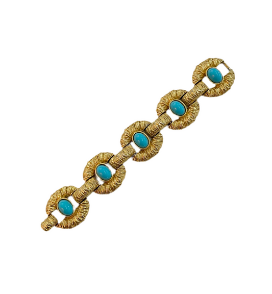60s Textured Gold Tone Turquoise Cabochon Bracelet