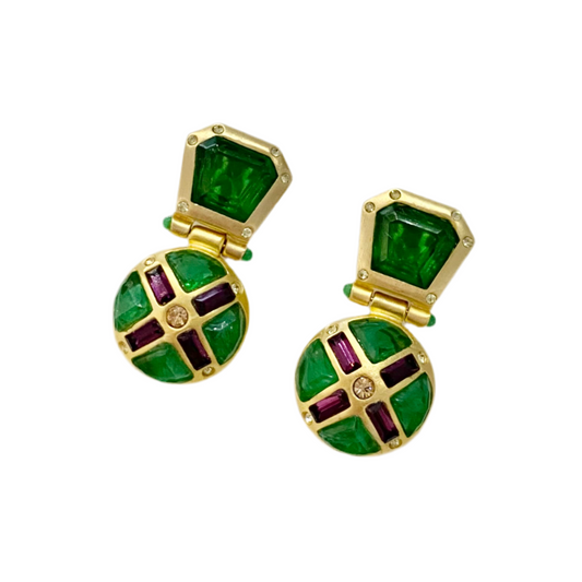 90s Green Lucite Earrings /w Purple Cabochons Replica Italy