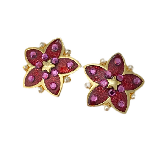 Gold Red Enamel Star Flower Crystal Earrings